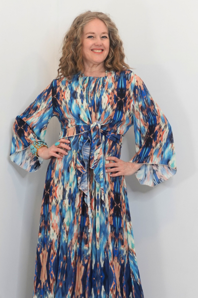 The TGNY Magic Blouse can be worn so many different ways. Wear it loose or tied in front to create a waist and offer tummy coverage or as a wrap top for a more slim line look. I can be worn with the pants, skirt, over the dress in the same fabric or on it’s own with jeans.